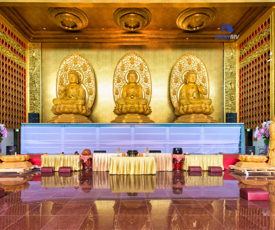 เมื่อก้าวเท้าเข้าสู่บริเวณวัด คุณจะพบกับความอลังการของวิหารขนาดใหญ่ที่ประดิษฐานพระพุทธรูปทองคำ 3 องค์ (พระศรีศากยมุนีพุทธเจ้า, พระอมิตาภพุทธเจ้า และพระเภสัชคุรุพุทธเจ้า) ซึ่งเปี่ยมไปด้วยพลังและบารมี